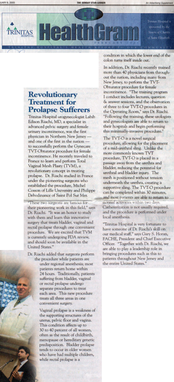 Trinitas Hospital urogynecologist Labib Edison Riachi, MD, a specialist in advanced pelvic surgery and female urinary incontinence, was the first physician in North en New Jersey and one of the first in the nation to successfully perform the gynecare TVT-obturator procedure for female incontinence.